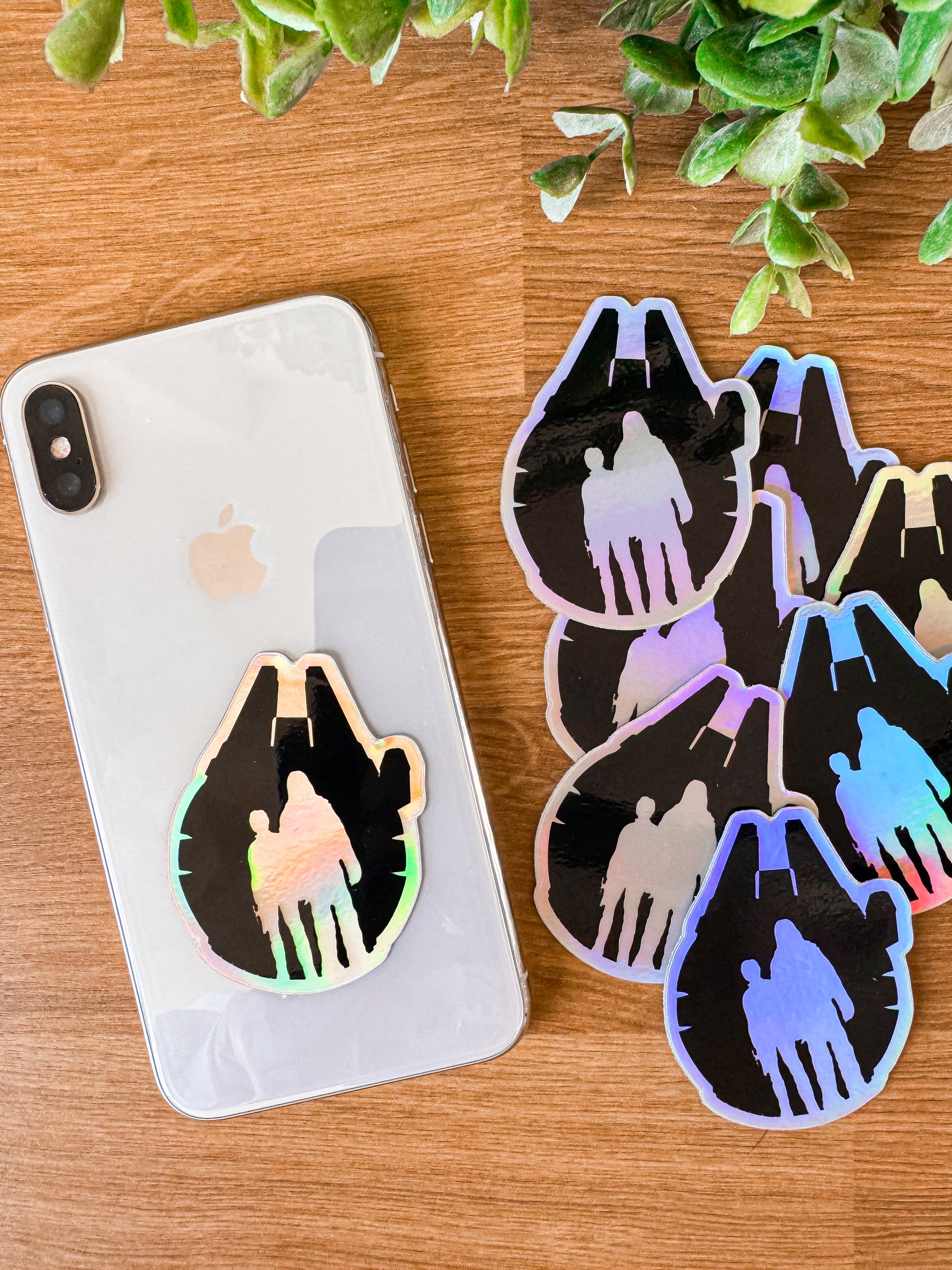 Galaxy Far Far Away-inspired holographic sticker perfect for kindles, tablets, phone cases, laptops, skateboards, notebooks, etc. Every sticker is protected with a laminate that shields it from water damage and scratches.