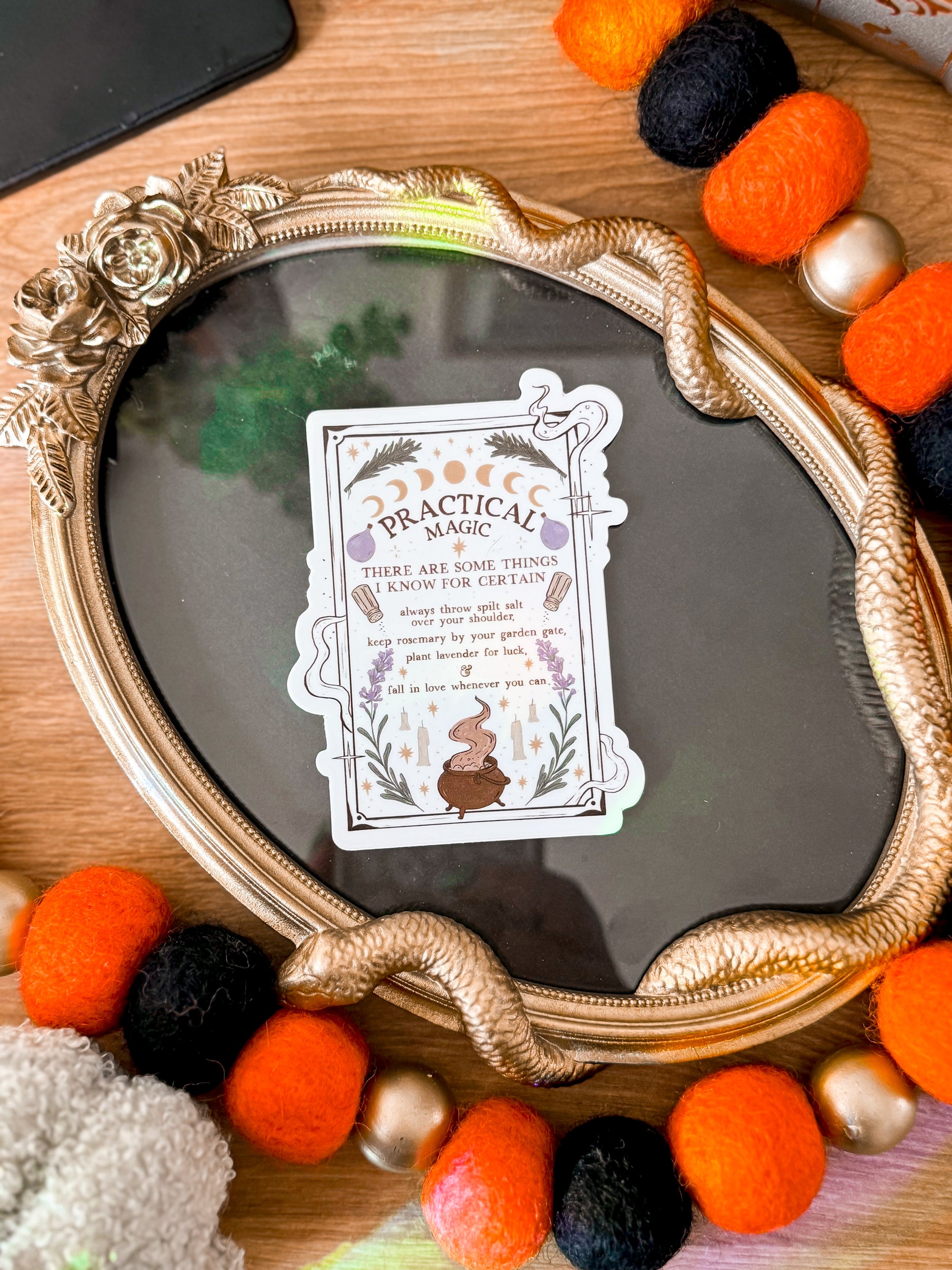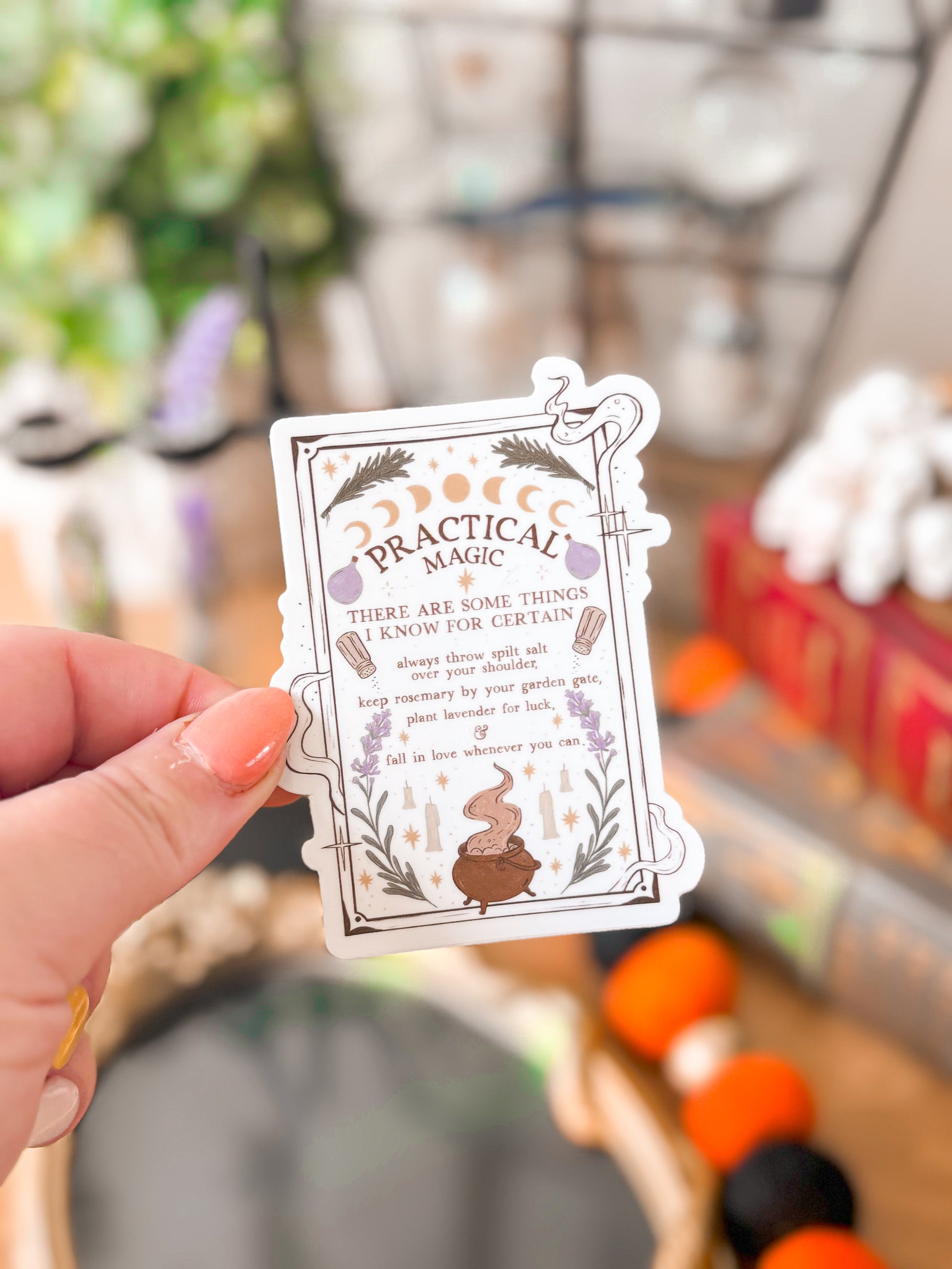 Practical Magic-inspired glossy vinyl sticker perfect for kindles, tablets, phone cases, laptops, skateboards, notebooks, etc. Every sticker is protected with a thick, durable vinyl that shields it from water damage and scratches.